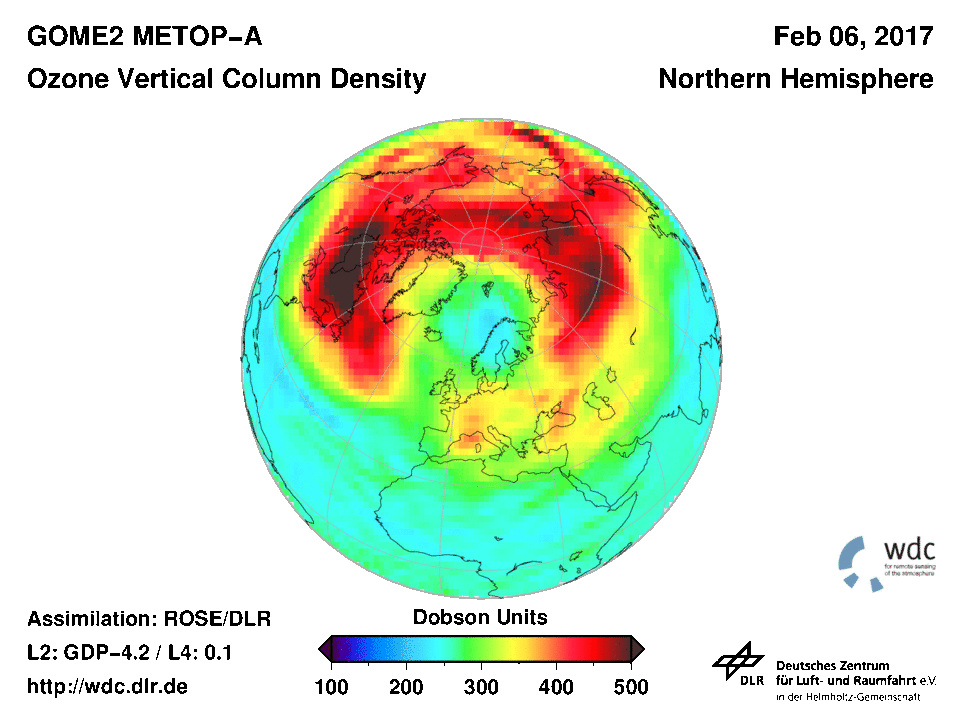 Seit etwa Anfang Februar beobachten wir eine ausgeprägte Abreicherung der Ozonkonzentration über Nordeuropa (Bild 1). Diese Situation ist ungewöhnlich für die Nordhalbkugel.