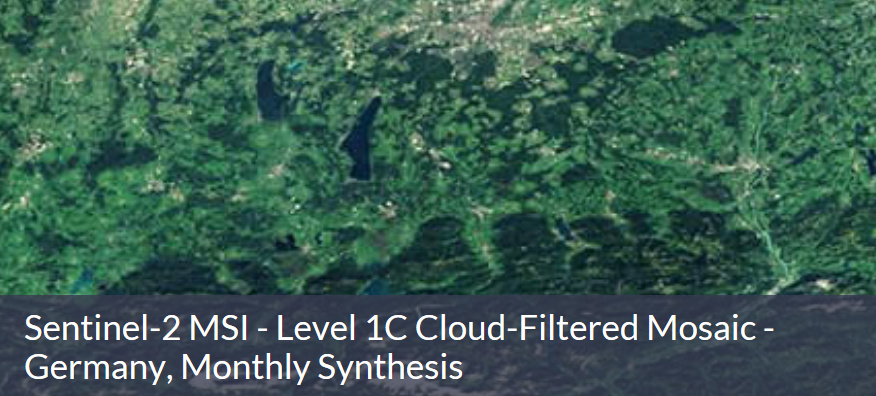 Zusätzlich zu den Sentinel-1, Sentinel-2 und Sentinel-3 Produkten sind jetzt über den Marktplatz von CODE-DE auch wolkengefilterte Mosaike der Sentinel-2 Daten über Deutschland verfügbar, die monatlich ergänzt und kachelweise online bereitgestellt werden.