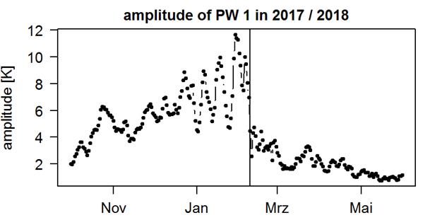 Eine solche Stratosphärenerwärmung wurde auch im Februar 2018 beobachtet. Hier ist die zuvor erhöhte Aktivität der Wellen um den 7. Februar 2018 stark eingebrochen (siehe Abbildung 1).