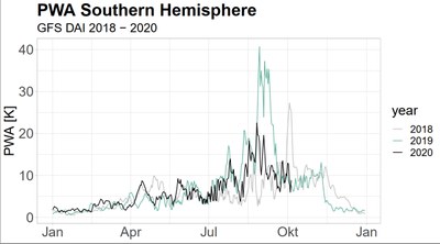 Die Abbildung zeigt die Stärke dieser planetaren Wellen in den Jahren 2018, 2019 und 2020 in etwa 30 km Höhe auf der Südhalbkugel.
