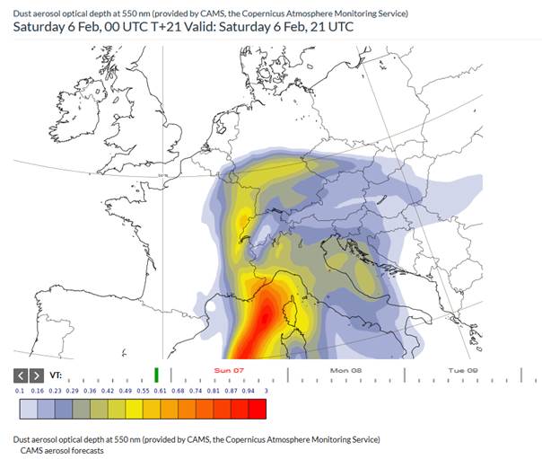 Dieses Jahr gab es bereits ungewöhnlichen Schneefall in Madrid und den Sturm „Goran“. In den Alpen kam es nach einer längeren Kältephase nun zu starkem Tauwetter mit Hochwassergefahr im Alpenvorland. Zeitgleich kam es zu einem Kälteeinbruch an den norddeutschen Küsten und zu besonders starkem Schneefall in den Mittelgebirgen Deutschlands. Am vergangenen Samstag färbte dann ein starkes Saharastaubereignis den Schnee der Westalpen rot (siehe Abb. 1 und 2). Auf der Umweltforschungsstation Schneefernerhaus auf der Zugspitze zeigt sich das Ereignis vom 6. Februar deutlich in der Messung der Feinstaubpartikel (PM10). Aber auch in Stuttgart und in München färbte sich der Himmel grünlich gelb. Allein über Augsburg wurden jede Stunde etwa 75 Tonnen Wüstenstaub in einem nur 100 Metern schmalen Höhenbereich in 5 Kilometern Höhe transportiert.