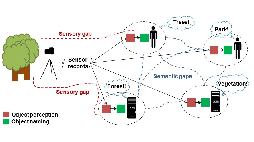 mit einer Animation, die zeigt, wie verschiedene Eigenschaften eines Bilds (wie seine Größe oder sein Gesichtsfeld) die Sensory gap beeinflussen. Mit dem ersten sehr kleinen Bild (siehe Bild unten) ist es sehr schwierig, das enthaltene Objekt zu identifizieren. Mit wachsender Bildgröße und zusätzlichen Kontextinformationen kann man das Objekt aus dem ersten Bild leichter erkennen. Es handelt sich um einen See.