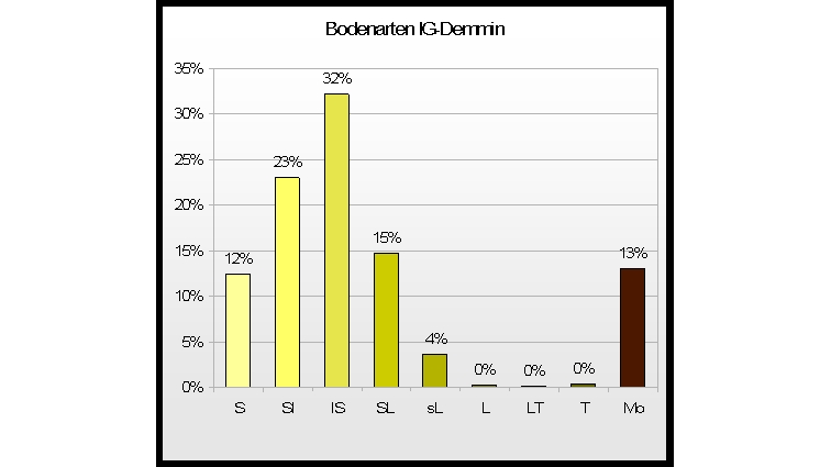 Die zuvor dargestellten erdgeschichtlichen Prozesse verdeutlichen, dass die anstehenden Böden relativ jung und somit kaum von Auswaschungs-, Versauerungs- und Verlagerungsprozessen betroffen sind. Die Bodensubstrate werden von lehmigen Sanden und sandigen Lehmen dominiert, die sich mit eingeschlossenen Sandlinsen oder lehmigen Bereichen abwechseln. Der nordöstlichste Teil des Teststandortes ist durch Sand-Braunerde und Sandersande ohne Wassereinfluss gekennzeichnet. Daran schließt sich die Grundmoräne der Vorpommerschen Lehmplatten an. Das Diagramm in Abb. 1 liefert einen Überblick über die prozentuale Verteilung der Bodenarten der IG Demmin.