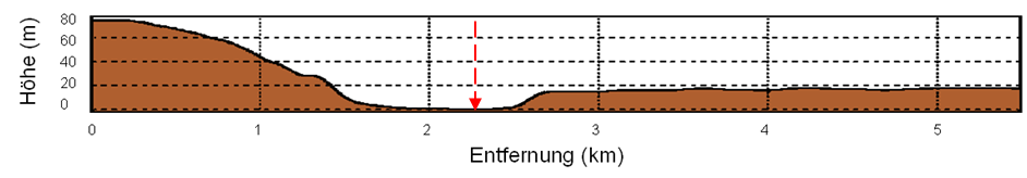 Das Höhenprofil verdeutlicht das unterschiedliche Relief der Landschaftszonen. Während der südliche Teil des Testgebietes Höhen bis zu 80 m über NN aufweist, betragen die Höhen des deutlich flacheren nördlichen Teils des Teststandortes ca. 20 m über NN. Darüber hinaus wird erkennbar, dass das Flussbett der Tollense in diesem Bereich nur wenige Meter über NN liegt.