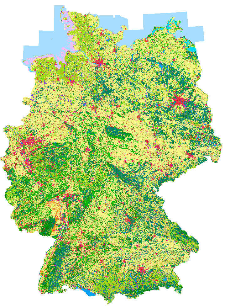 Mehr Details bezüglich der bei CLC verwendeten Methoden und der erzielten Ergebnisse in den einzelnen Zeitschnitten sind in dem Dokument “CORINE Land Cover products for Germany, created by DLR-DFD on behalf of the Federal Environment Agency (UBA) – an Overview” nachzulesen, siehe den Link rechts. Weitere Links erlauben den Download der CLC-Vektordaten oder davon abgeleiteten Rasterdaten: Im deutschen Kontext Links zu Webseiten von UBA und BKG, im europäischen Kontext Links zu den COPERNICUS Land-Monitoring-Diensten bei der Europäischen Umweltagentur (EEA). CLC Rasterdaten für Deutschland für WebGIS-Dienste sind auch über den EOC Geoservice am DLR einsetzbar.