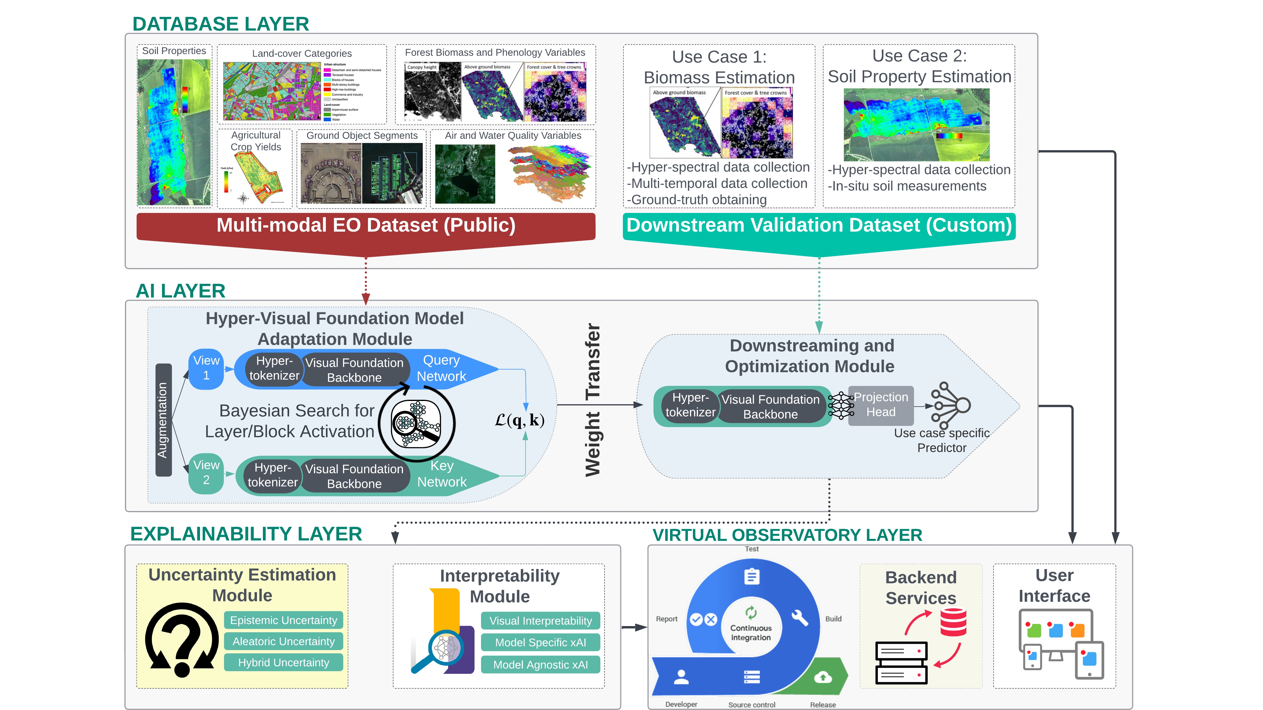 Das HYPER-AMPLIFAI-Projekt ist darauf ausgerichtet, visuelle KI-Grundlagenmodelle durch selbstüberwachtes Lernen mit hyperspektralen Bildern in Einklang zu bringen. Unser primäres Ziel ist es, diese Modelle so zu erweitern, dass sie nahtlos eine größere Bandbreite an Eingabegrößen und Kanaldimensionen aufnehmen können. Auf diese Weise wollen wir zwei wichtige Anwendungen erforschen: die Schätzung der Biomasse von Wäldern und die Vorhersage von Bodennährstoffen aus Hyperspektraldaten. Dieser ganzheitliche Ansatz zielt darauf ab, den Nutzen und die Vielseitigkeit von Hyperspektraldaten zu erweitern und neue Lösungen für dringende Umweltprobleme zu finden.