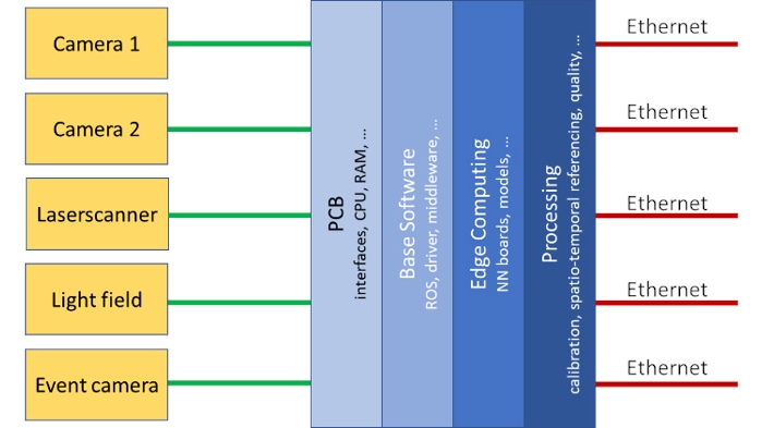 Ziel des Projekts SaiNSOR ist die Entwicklung von grundlegende Technologien und Methoden und diese in konkrete Messsysteme für programmübergreifende Anwendungen umzusetzen. Das Hauptziel ist die enge Verzahnung von Sensorik und Datenverarbeitung mit Methoden der Künstlichen Intelligenz (KI). Die Hauptaufgabe von MF-PBA innerhalb des Projekts ist die Entwicklung, Implementierung und Evaluierung von Deep-Learning-basierten Ansätzen zur Onboard-Informationsextraktion aus Luftbildern. Der Schwerpunkt liegt dabei auf der Erkennung von Autos und Personen sowie der Segmentierung von Straßen und Gebäuden in Echtzeit an Bord einer Drohne, eines Hubschraubers oder eines Flugzeugs. Die Schnittstelle wird in enger Zusammenarbeit mit dem Institut für Optische Sensorsysteme (OS) und dem Institut für Flugsysteme (FT) entwickelt. Die Methoden werden mit den Kamerasystemen 4k (MF-PBA) und MACS (OS) getestet.