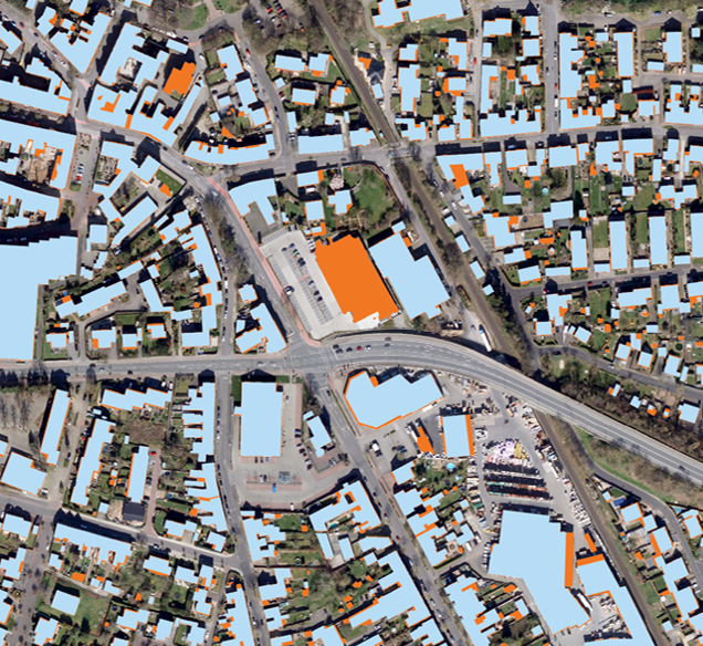 Digitales Orthophoto von Geobasis NRW überlagert mit: Blau: amtliches Gebäudemodell des BKG Orange: detektierte Gebäude/Unterkünfte