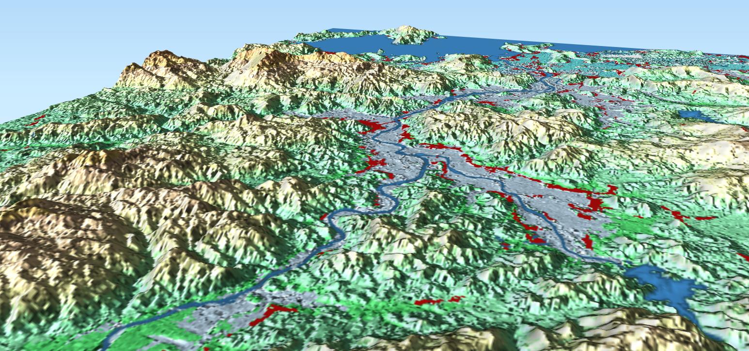 Perspektivsicht auf die Provinz Phú Yên in Vietnam, farbschattierte Darstellung des TanDEM-X Modells (© DLR 2020) mit Wassermaske und Siedlungsdaten aus dem Global Urban Footprint