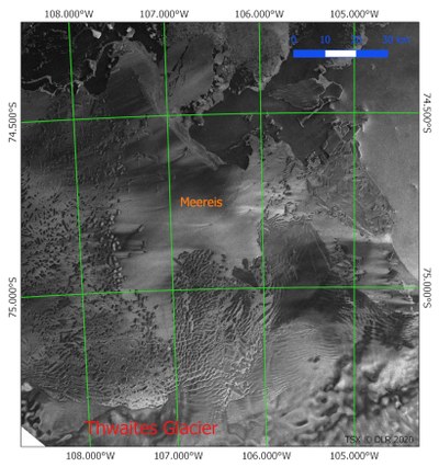 Etwas weiter westlich präsentiert sich das Trümmerfeld des Thwaites Glacier Schelfeises in einer TerraSAR-X Aufnahme vom 11.02.2020. Der Zerfall eines Großteils des Schelfeises liegt schon Jahre zurück. Gehalten hat sich bisher noch eine Schelfeis-Zunge östlich von 107°W, die aber auch stetig an Fläche verliert und innerhalb absehbarer Zeit ebenso verschwinden wird. Das TerraSAR-X Bild wurde zur Unterstützung der aktuell laufenden Expedition des amerikanischen Forschungsschiff Nathaniel B. Palmer aufgenommen. Es dient den Wissenschaftlern an Bord bei der Planung ihrer Arbeiten im Amundsen Meer und liefert in Kombination mit Sentinel-Daten und weiteren TerraSAR-X Aufnahmen detaillierte Hinweise über den Zustand des Thwaites Glaciers. Zusammen mit dem Pine Island Glacier bildet er den Hotspot aktueller Forschungsprojekte, da deren Massenverluste bereit jetzt – und in der Zukunft deutlich verstärkt – zum Anstieg des Meeresspiegels beitragen.