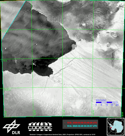 Am Pine Island Gletscher im Bereich der Amundsen See bei 101°West und 75°Süd kam es, wie schon seit einigen Monaten zu vermuten war, zu einem erneuten Abbruch großer Eismassen. Wo an gleicher Stelle im November 2018 ein großer zusammenhängender Eisberg entstanden ist, zeigt sich im aktuellen Sentinel-1 Bild ein Mosaik größerer und kleinerer Eisberge. Über die letzten Jahre hinweg konnten solche Kalbungsereignisse in immer kürzeren zeitlichen Abständen beobachtet werden. Es ist daher anzunehmen, dass dieser Abbruch nur einen Schritt bei dem sukzessiven, landeinwärts gerichteten Zerfall des Gletschers darstellt.