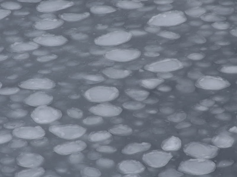 Natürlich soll der Blick in diesem Beitrag nicht nur auf die großen Eisformationen gerichtet sein. Während Agulhas II in der Penguin Bukta lag, konnten auch kleinskalige Phänomene wie zum Beispiel die Entstehung des so genannten „Pancake“ Eises aus direkter Nähe beobachtet werden.