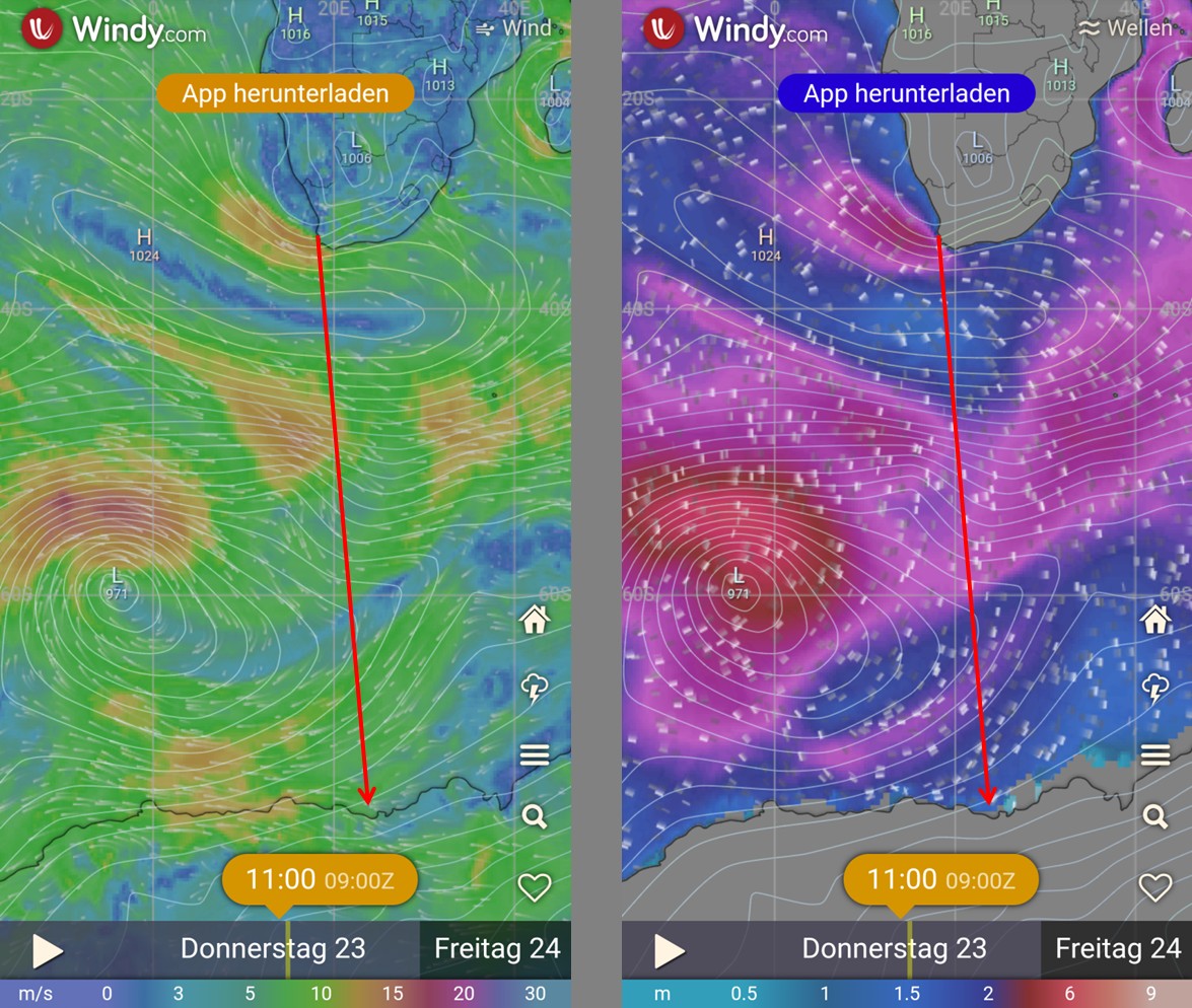 Ein Blick auf aktuelle Winddaten und Wellenhöhen verrät die bevorstehenden Bedingen auf See. Der rote Pfeil markiert den ersten Fahrtabschnitt.