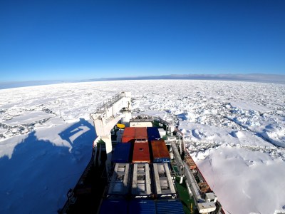 Über Nacht, besser gesagt, während der drei Stunden und zwölf Minuten zwischen Sonnenuntergang und Sonnenaufgang, lag das Schiff nördlich von Dog’s Head, wo am nächsten Morgen auch zunächst mit der Entladung begonnen wurde. Nach ca. 2h wurden aufgrund des starken Wellengangs, der das Absetzen der Container auf dem Schelfeis sehr erschwerte, die weiteren Entladearbeiten in die südlich gelegene Schelfeisbucht verlagert. Die drei Tage zuvor aufgenommene SpotLight-Aufnahme versprach weitere Fracht dort sehr viel einfacher auf einer scheinbar stabilen Meereisdecke entladen zu können. Beim Befahren der Bucht wurde jedoch schnell klar, dass dieser Bereich erst tags zuvor aufgebrochen war und sich uns nun als spektakuläres Mosaik aus Eisschollen präsentierte. Wieder einmal dürfte allen klar geworden sein, dass sich die Bedingungen in der Antarktis sehr schnell ändern können!