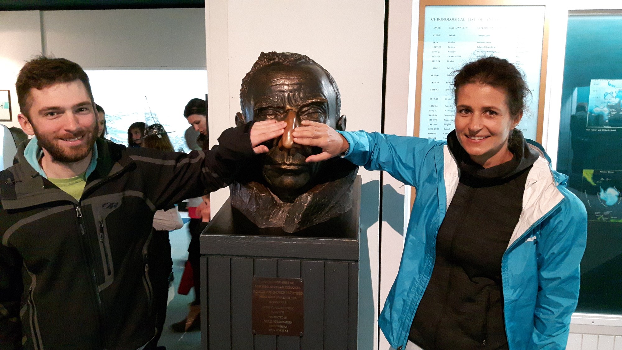 Zusammen mit meinem Kollegen Oliver Marsh beim Besuch von Amundsens Büste im Canterbury-Museum. Das Reiben ihrer inzwischen glänzenden Nase sichert eine gelungene Expedition.