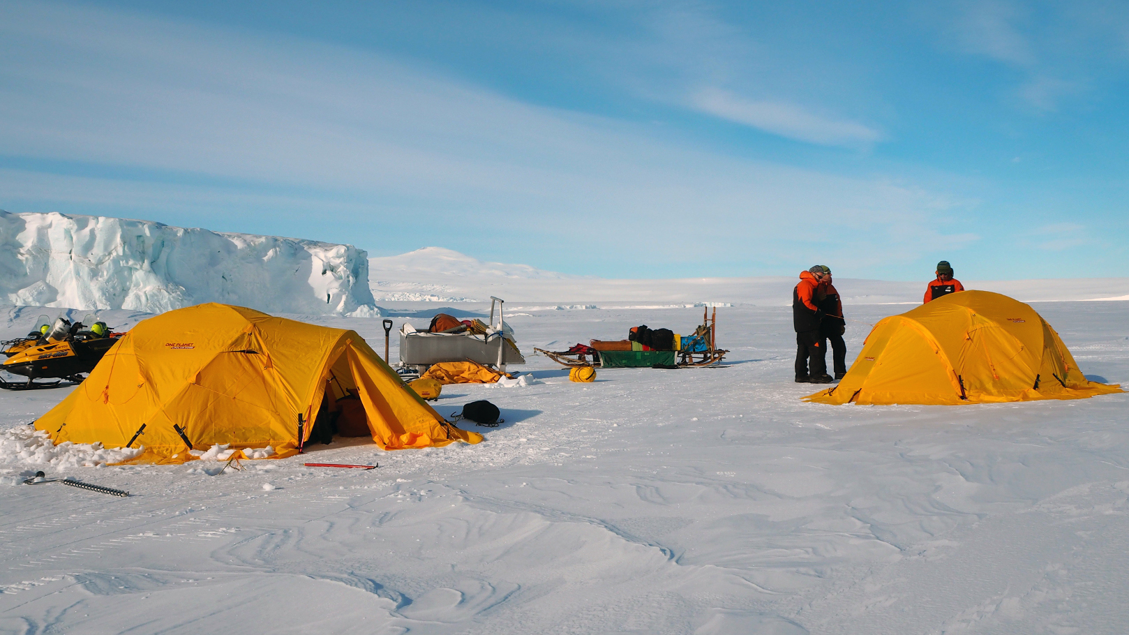 Das Lager für die Nacht ist direkt an der Erebus-Eiszunge. Nach Ankunft mit Skidoos haben wir für Trainingszwecke die Zelte aufgestellt und die Ausrüstung zum Kochen ausgepackt.
