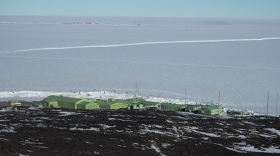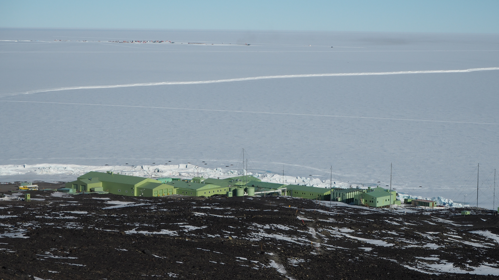 Im Hintergrund auf dem Eis der Williams-Landeplatz. Die durchs Bild laufende Kante markiert den Übergang vom Schelfeis zum Meereis. Vor Scott Base sieht man eine Reihe dunkler länglicher Punkte auf dem Eis. Das sind Robben, die ihre Brutzeit dort verbringen.