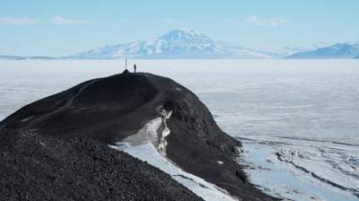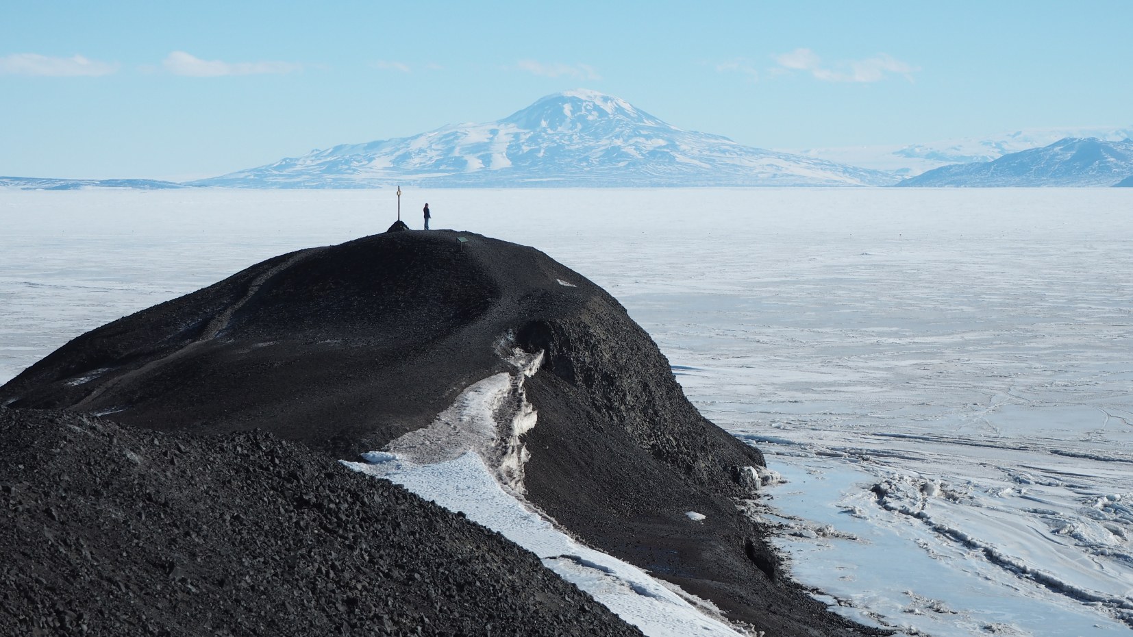der 1902 während der ersten britischen Antarktisexpedition in der Nähe sein Leben verlor. Mount Discovery im Hintergrund deutet an, wie nahe das Transantarktische Gebirge ist.