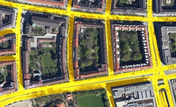 Ein Beispiel für das Ergebnis der Methode. Die gelbe Farbe zeigt die extrahierten Straßen.