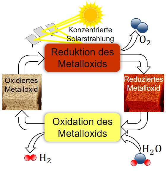 In den betrachteten und im Bild gezeigten solar-thermochemischen Kreisprozessen wird ein Redoxmaterial zunächst mit konzentrierter Solarenergie reduziert. Dann wird es wieder von Wasserdampf, Kohlendioxid oder einer Mischung dieser Gase oxidiert, wobei jeweils Wasserstoff, Kohlenmonoxid oder Synthesegas entsteht. Das Synthesegas dient als Grundstoff für synthetisch erzeugte Kohlenwasserstoffe, insbesondere für Kerosin und andere flüssige Kraftstoffe. Das Projekt SolarFuelNow orientiert sich an Reaktoren mit einer monolithischen Struktur des Redoxmaterials, wie sie im Projekt ASTOR_ST verwendet werden.