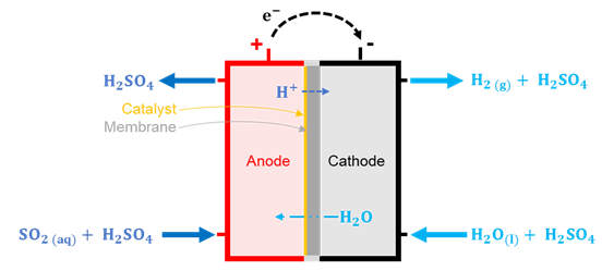 Die SO2-depolarisierte Elektrolyse basiert auf der Technologie der Polymer Elektrolyt Membran (PEM) Elektrolyse zur Wasserspaltung. Sie ist ein vielversprechendes Elektrolyse-Verfahren, um aus einer SO2/H2O-Mischung Wasserstoff und Schwefelsäure zu erzeugen. Dieser Prozess ist thermodynamisch besonders effizient und ermöglicht die Erzeugung von Schwefelsäure, welche im Rahmen der Kreislaufwirtschaft direkt in einem Prozess zur Aufarbeitung zinkhaltiger Abfälle eingesetzt wird. Der Wasserstoff kann dann verwendet werden, um fossile Energieträger beim Schwefelsäurerecycling zu ersetzen.