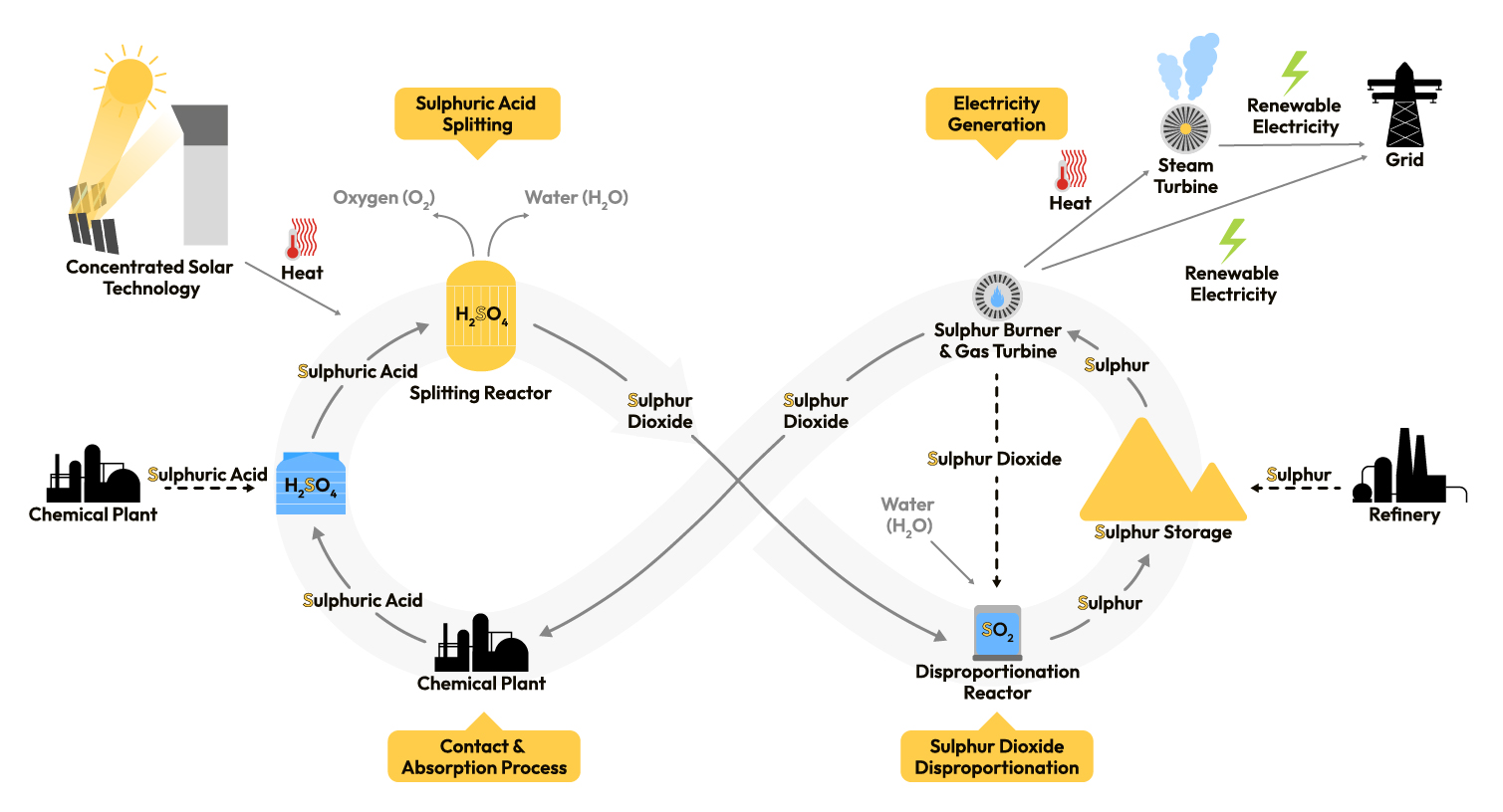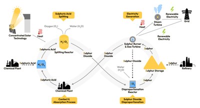 Das Verfahren stellt eine innovative Lösung für die Speicherung von Sonnenenergie in festem elementarem Schwefel dar, ohne dass dabei Schwefeldioxid in die Atmosphäre abgegeben wird.
