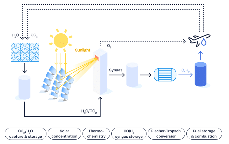 Während die Elektrifizierung und wahrscheinlich auch Wasserstoff eine große Bedeutung für die Dekarbonisierung des Verkehrs haben werden, wird es weiterhin einen Bedarf an energiereichen flüssigen Kohlenwasserstoffkraftstoffen geben – vor allem für den Luft- und Schiffsverkehr. Biokraftstoffe der ersten Generation können aufgrund von Verfügbarkeit und Nachhaltigkeit nicht die erforderlichen Mengen liefern. Skalierbare Technologien sind also nötig, um den langfristigen Kraftstoffbedarf zu decken. Dafür eignet sich Solarstrahlung als Energieform, da sie unter den erneuerbaren Energien am besten zu skalieren ist.