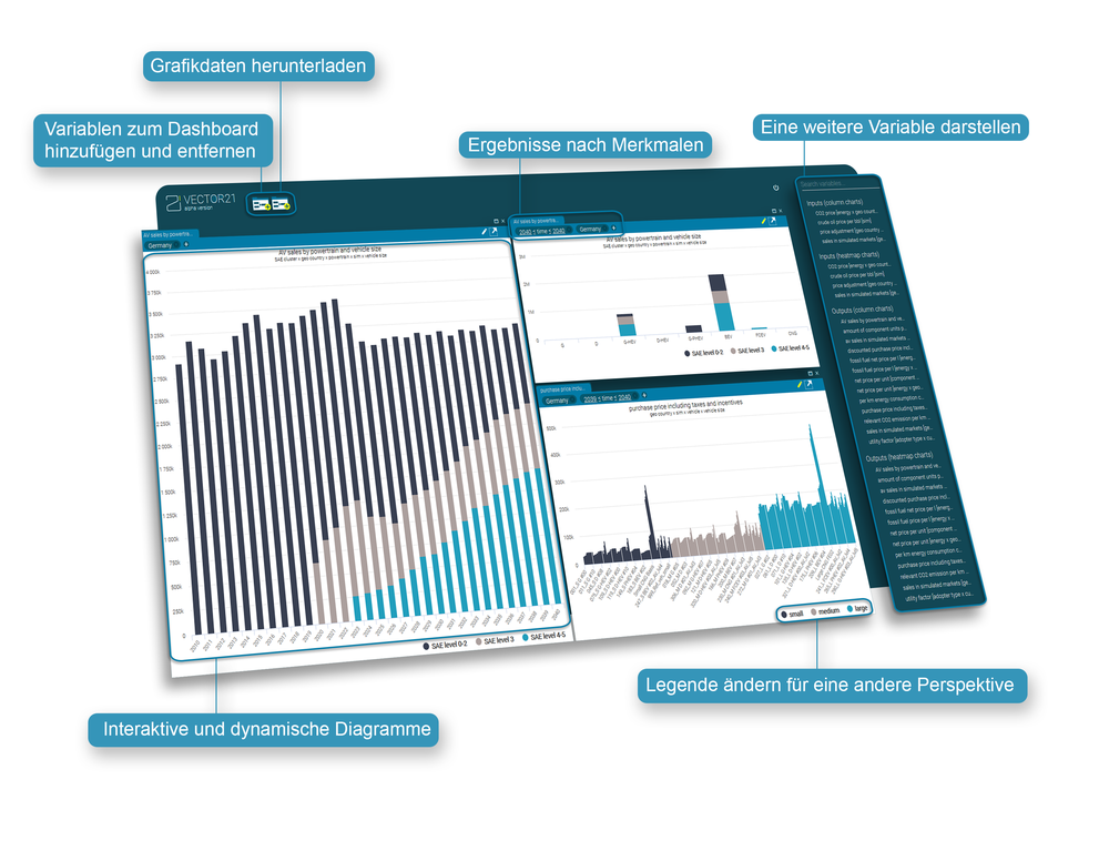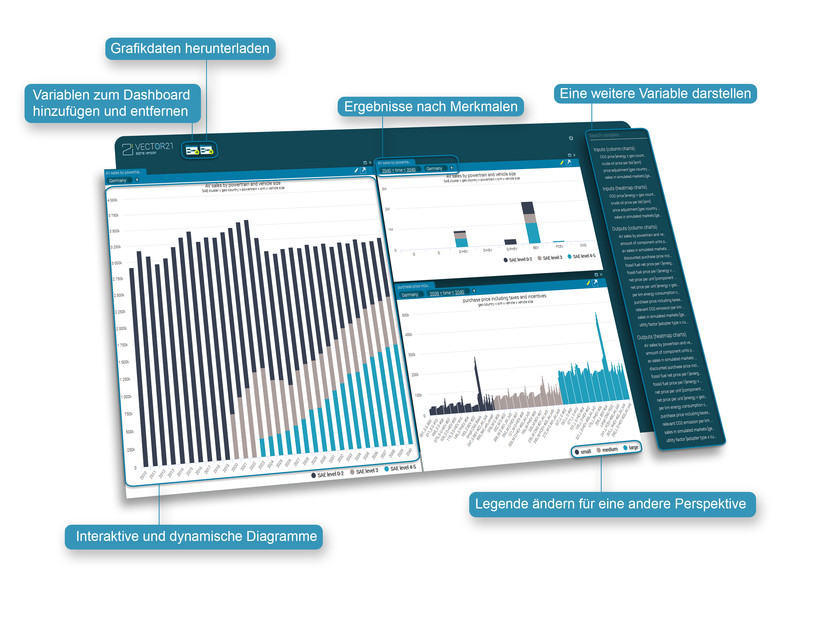 Seit 2007 befasst sich das Institut für Fahrzeugkonzepte mit der Erforschung von Fahrzeugmärkten und derer zugrundeliegender Kausalitäten und gegenseitiger Abhängigkeiten. VECTOR21 hat diese Kenntnisse in ein detailliertes Bottom-Up-Szenario Modell und eine entsprechende Marktanalysesoftware zur Simulation zukünftiger Marktentwicklungen einfließen lassen.