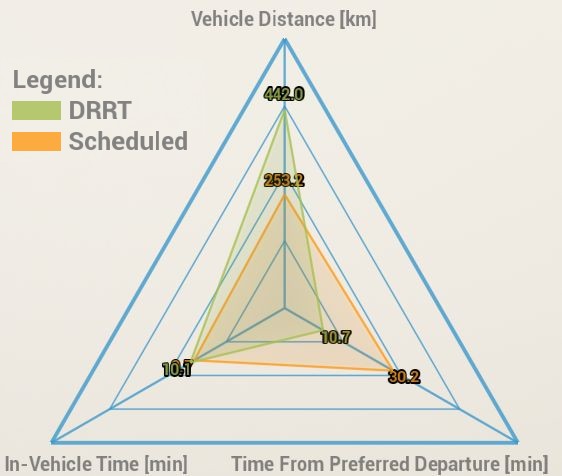 Die folgende Abbildung zeigt die durchschnittlichen Ergebnisse über mehrere Simulationen für den Basisfall mit zwei Fahrzeugen und unter der Annahme, dass Reiseanfragen 5 Minuten vor dem geplanten Reisebeginn gestellt werden. Wir sehen eine deutliche Verbesserung der Servicequalität, da die Fahrgäste im Durchschnitt 10 Minuten nach ihrer bevorzugten Abfahrtszeit abgeholt werden können - um den gleichen Effekt im Linienverkehr zu erzielen, müsste man alle 20 Minuten Zugfahrten anbieten, was eine Verdreifachung der Fahrzeugdistanz bedeutet. Im DRRT-Betrieb hingegen würde sich die zurückgelegte Strecke nur von 252 km auf 442 km (+75%) für die gewählte Linie erhöhen.