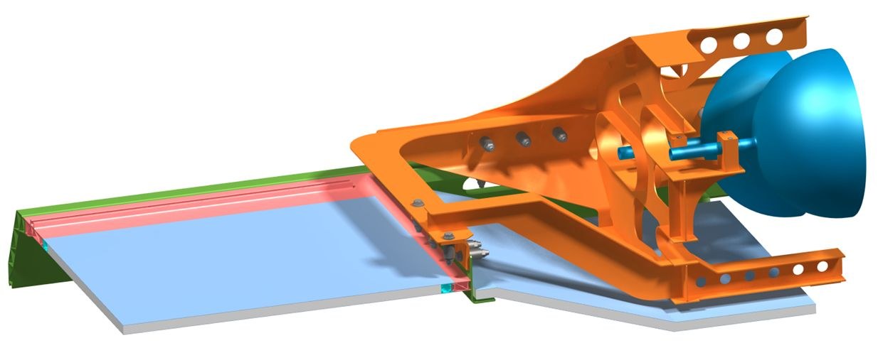 Mittragender Tankrahmen, blau: Sandwichstruktur, orange: Tankrahmen inkl. H2-Tank Anbindung, türkis/rot: Übergangsprofile der MMD zur herkömmlichen Strangpressprofil-Bauweise. Deutlich zu erkennen, das abgesenkte bzw. aufgebrochene Dach unterhalb des Rahmens