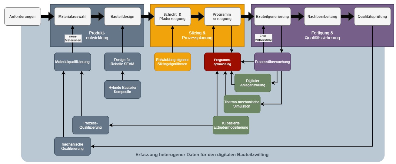 Digitale Prozesskette für Robotic SEAM (oben) und Forschungsfelder am Institut (unten)