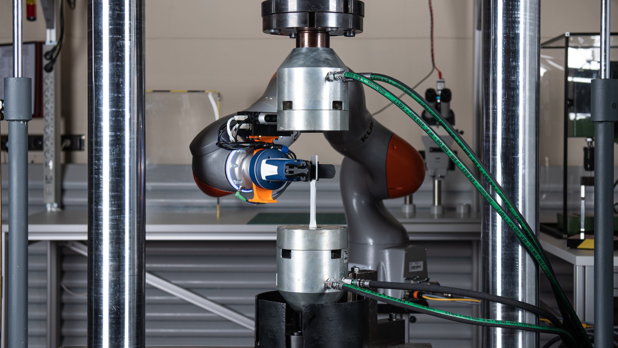 Durch Automatisierung und intelligente Sensorik ist in der Werkstoffentwicklung ein schnelles Testen einer hohen Anzahl von Proben möglich. Die dabei gewonnenen Daten dienen beispielsweise zur Bewertung von Werkstoffeigenschaften wie Zugfestigkeiten oder Ermüdungskennwerten. Während des Versuchsablaufs unterstützen klassische Algorithmen sowie maschinelles Lernen Entscheidungsprozesse und werten die Versuchsdaten aus. Somit kann die Werkstoffprüfung erheblich beschleunigt werden.