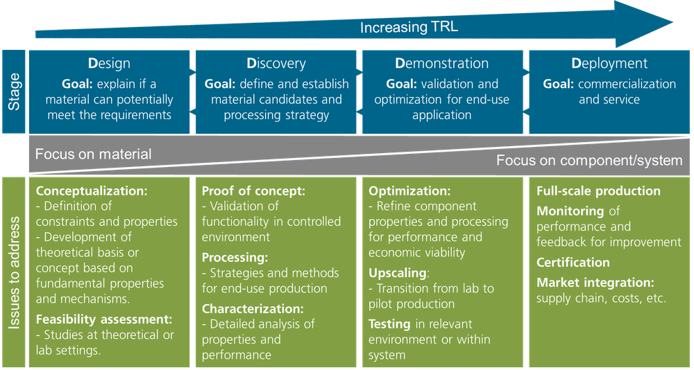 Die vorgenannten vier Hauptstufen der Werkstoffentwicklung sind in der nachfolgenden Abbildung dargestellt, in der auch die Ziele und die in jeder Phase zu adressierenden Fragestellungen kurz erläutert werden. Durch diesen D4 Ansatz kann das Institut den Schwerpunkt seiner Forschungstätigkeiten präzisieren und den technologischen Reifegrad der Ergebnisse nach Abschluss der Forschungsaktivitäten bewerten.