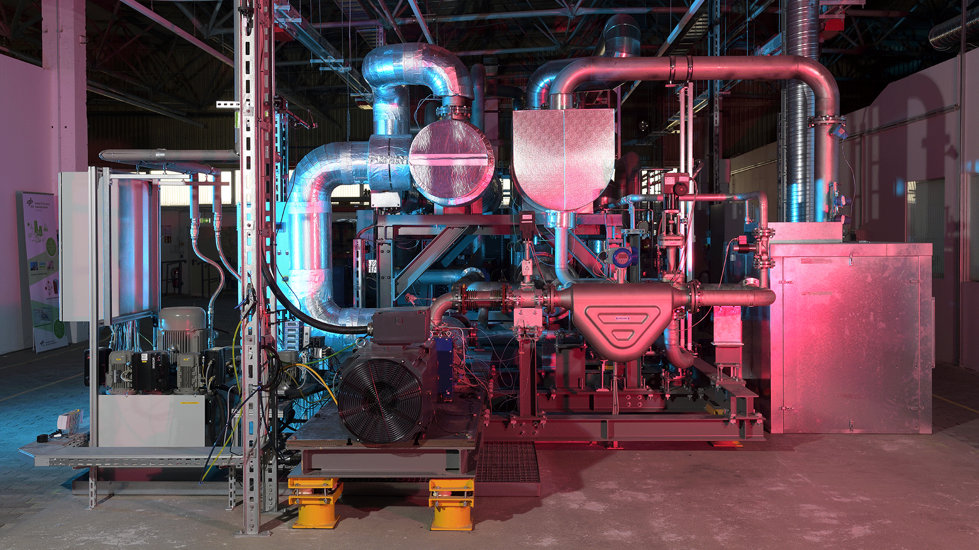 Der Hochtemperatur-Wärmepumpen-Prototyp „CoBra“ (Cottbusser Brayton Prozess) mit heißer Wärmesenke rechts und kalter Wärmequelle links soll Prozesswärme bis circa 300 Grad Celsius liefern. Vorne mittig der Generator zur Stromrückgewinnung aus der Turbine, links das Ölsystem und rechts das Coriolis Massenstrom-Messgerät.
