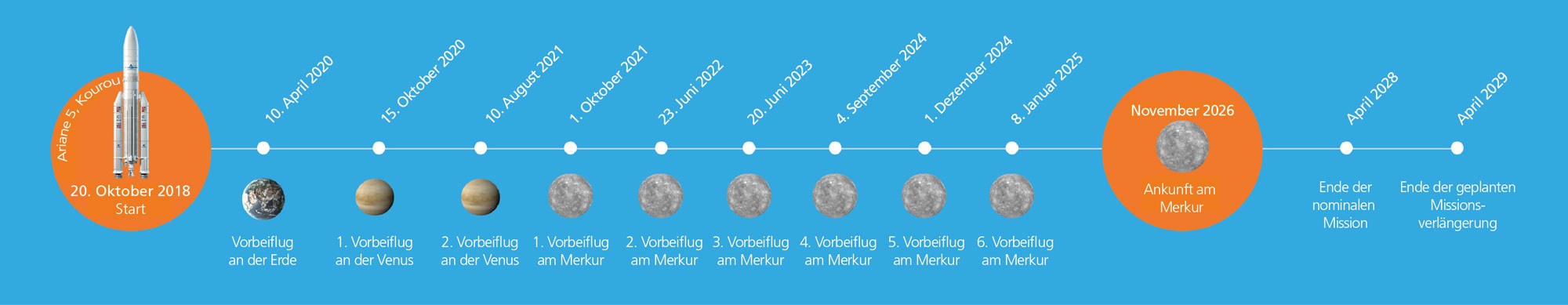 Raumflüge von der Erde ins innere Sonnensystem sind wegen der Anziehungskraft der Sonne technisch ausgesprochen schwierige Unternehmungen. Die europäisch-japanische Mission BepiColombo wird dafür acht Jahre benötigen. Dabei wird das Sondengespann im Laufe der Jahre und durch mehrere Nahvorbeiflüge an der Erde, an der Venus (zweimal) zunächst abgebremst und wird schließlich durch sechs Vorbeiflüge am Merkur selbst auf eine Umlaufbahn um die Sonne gelenkt, die sich tangential immer mehr dem Merkurorbit annähert. Schließlich wird BepiColombo im November 2026 in eine Umlaufbahn um den Merkur gelenkt.