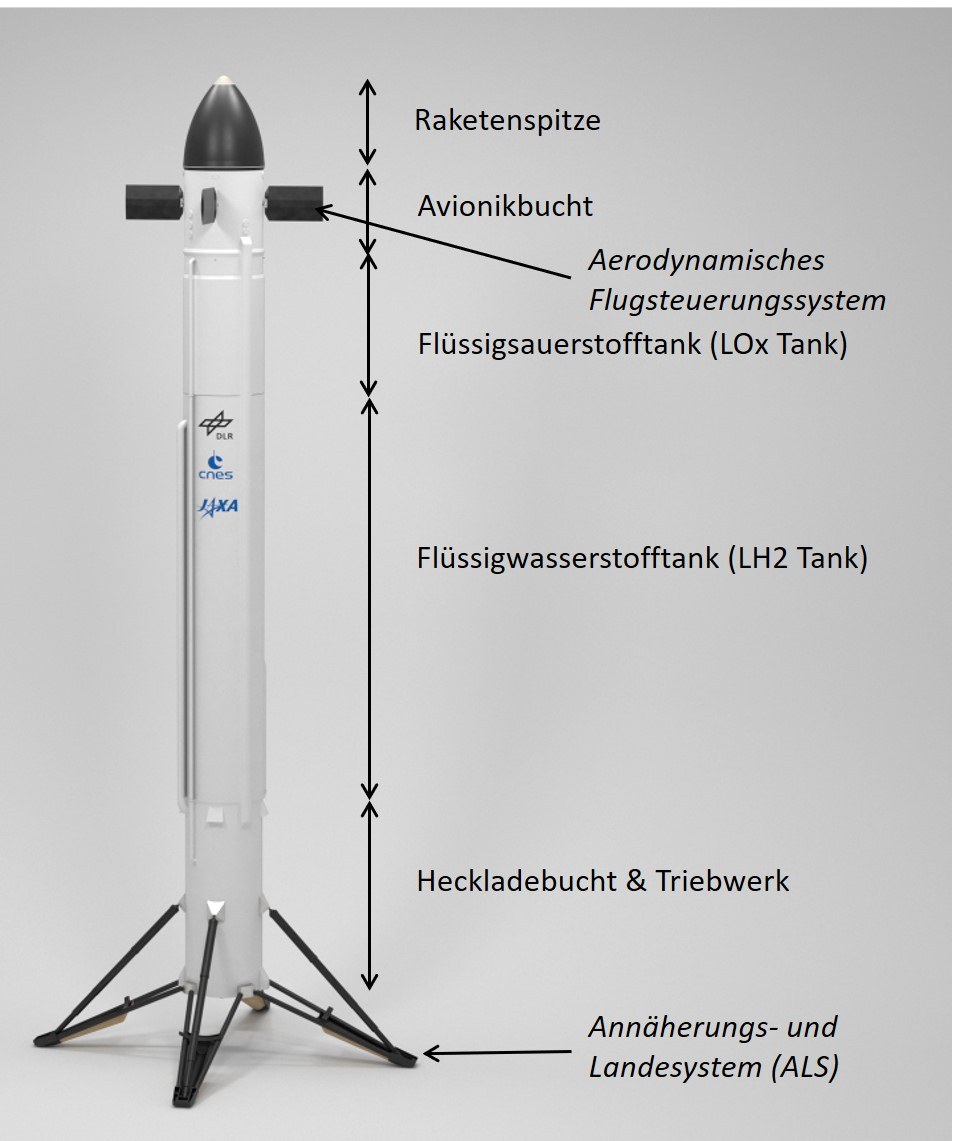 CALLISTO besteht aus fünf Hauptstrukturen: Raketenspitze, Avionikbucht, Flüssigsauerstofftank, Flüssigwasserstofftank und Heckladebucht. Zwei ausklappbare Systeme (aerodynamisches Flugsteuerungssystem und Annäherungs- uns Landesystem), die vom DLR entwickelt und bereitgestellt werden sind besonders relevant für eine wiederverwendbare Raketenstufe.