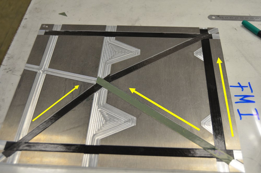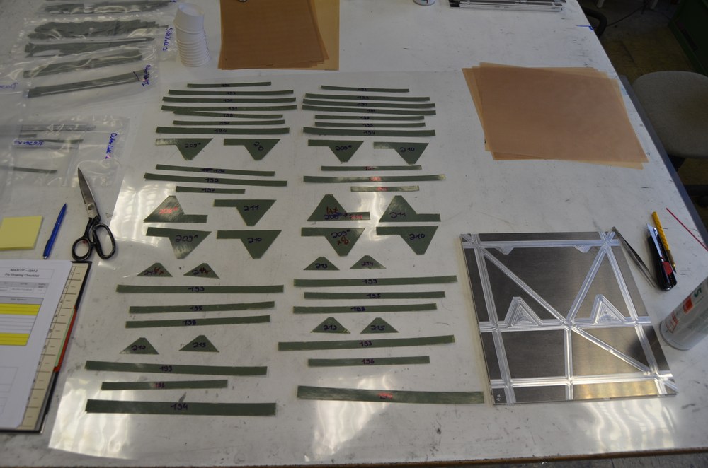 Beispielhaft zeigt Abbildung 4 die Halbzeugeinzelteile, die zum Bau der Deckschichten einer der Seitenfachwerkwände des Landers benötigt werden. Die zugeschnittenen Teile, bei denen es sich um eine fertige Faser-Kunststoffmischung (sogenanntes Prepreg) mit in nur einer Richtung verlaufenden Fasern handelt, werden dazu zunächst in eine Form eingelegt (siehe Abbildung 5) und so zu einer fachwerkförmigen Deckschichtlage zusammengefügt. Anschließend wird eine zweite Deckschicht gefertigt, bevor dann beide mit dem Schaumkern verklebt werden und somit die bereits in Abbildung benannte Fachwerkseitenwand entsteht. In gleicher Art und Weise werden noch vier weitere äußere Fachwerkwände beziehungsweise die mittlere Fachwerkwand gefertigt. Um schließlich aus den einzelnen Fachwerkwänden eine dreidimensionale Struktur zu erzeugen, müssen diese noch entlang ihrer Außenkanten über sogenannte Schublaschen miteinander verbunden werden. Diese L-förmigen Winkelprofile (siehe Abbildung 3, rechts) bestehen ebenfalls aus CFK, allerdings sind die Fasern hierbei in zwei Richtungen senkrecht zueinander angeordnet und wie bei einem Leinwandgewebe miteinander verwoben. Des Weiteren sind die Schublaschen in einem 45-Grad-Winkel zu den Stabachsen ausgerichtet, was die Übertragung der Lasten von einer Fachwerkwand auf die Nächste erlaubt. Die Oberseite des Landers besteht ebenfalls aus zwei Sandwichbauteilen, allerdings sind diese vollflächig und sowohl die Deckschichten als auch der Honigwabenkern bestehen aus Aluminium. Beide dieser Sandwichbauteile sind mit dem Rest der MASCOT-CFK-Faserverbundstruktur verschraubt, sodass eine Öffnung zum Einbau der Instrumente und Systemkomponenten in den Lander bleibt. Der Grund, warum die beiden oberen Sandwichbauteile aus Aluminium gefertigt sind, liegt darin, dass es sich hierbei um sogenannte Radiatorflächen handelt. Diese Flächen bilden eine Wärmesenke, sodass die überschüssige Wärmeenergie (beispielsweise vom Bordcomputer) dorthin strömen kann, sich in den gut wärmeleitenden Aluminiumdeckschichten verteilt und anschließend durch Wärmestrahlung an die Umgebung abgegeben wird. Neben der Funktion als Radiator erfüllt das größere der beiden Aluminiumsandwichbauteile aber auch eine strukturelle Funktion, ohne die die Gesamtstruktur eine deutlich geringere Steifigkeit hätte.