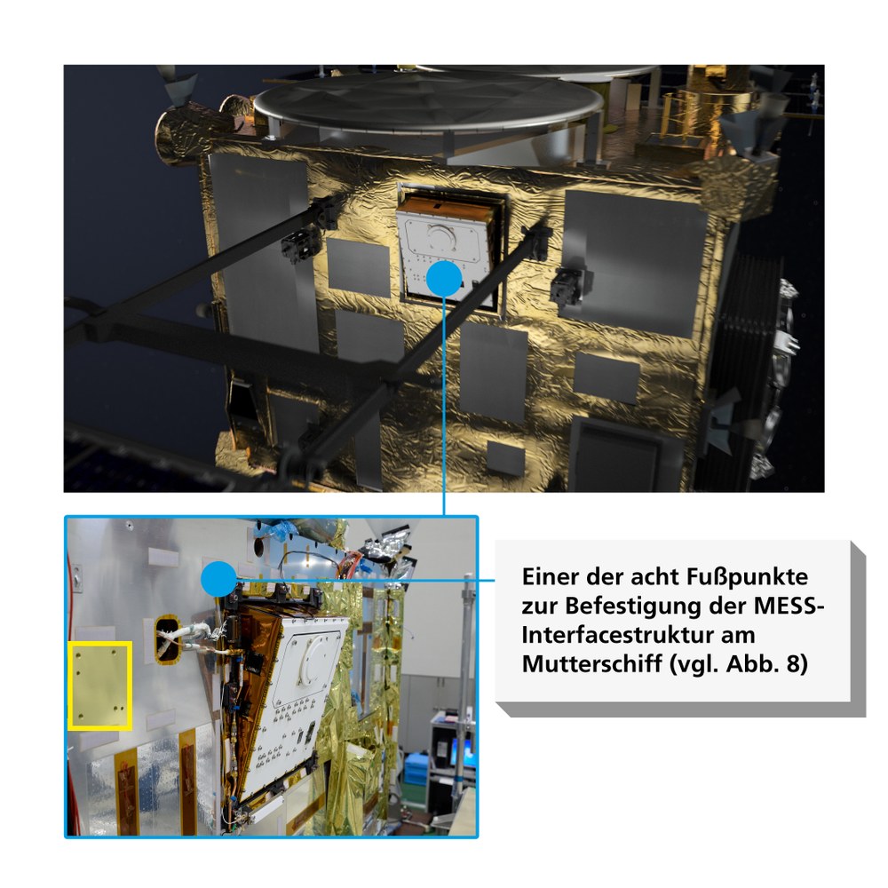 Wenn der MASCOT-Lander von seinem Mutterschiff abgetrennt wird, um im Anschluss auf dem Asteroiden zu landen, dann eröffnet sich der Blick auf ein verborgenes, aber genauso wichtiges Strukturbauteil. Eingebettet in einen Ausschnitt in der Y-Seitenfläche der Hayabusa2-Sonde (Abbildung 6 und 7) befindet sich die sogenannte mechanische und elektrische Interfacestruktur (MESS) zwischen dem MASCOT-Lander und Hayabusa2 (Abbildung 8). Diese bildet die mechanische und elektrische Schnittstelle zwischen den beiden Raumfahrzeugen und ist ähnlich wie der Lander als eine Fachwerkstruktur ausgelegt.