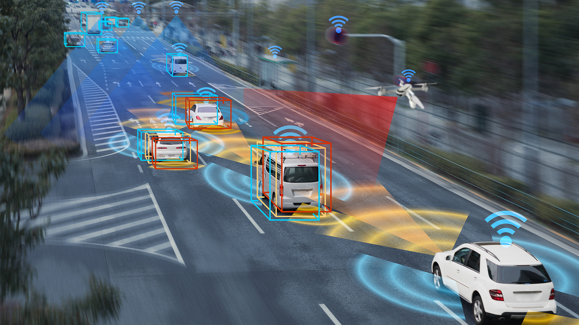 Fahrzeuge kommunizieren mit Drohnen und der Verkehrsinfrastruktur und tauschen Echtzeitinformationen über die erfasste Umgebung aus.