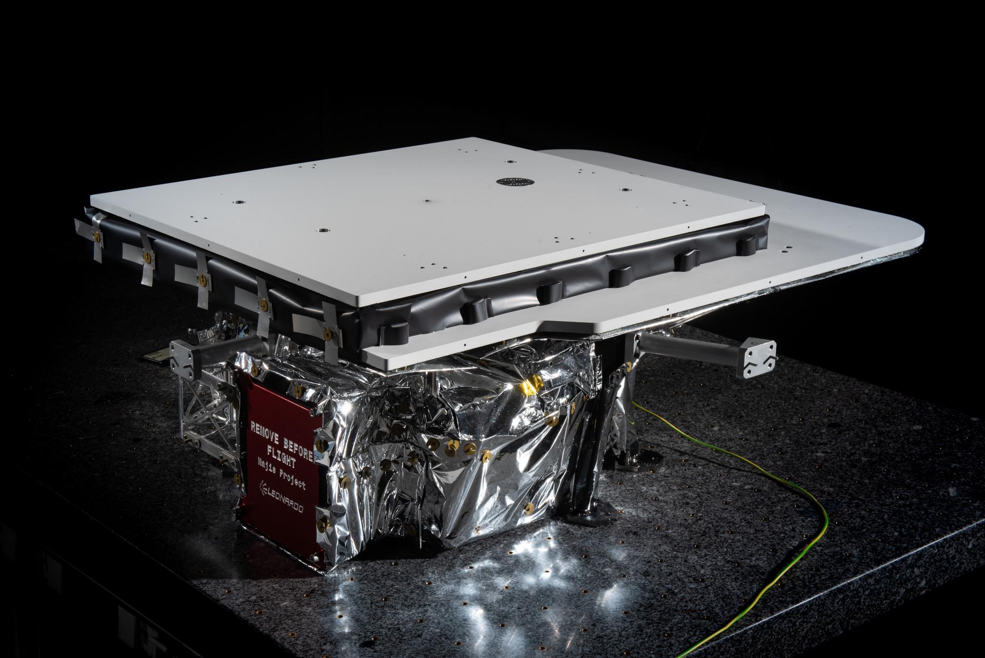 Die Blende der Optik ist durch eine rote Abdeckung geschützt. Bei den weißen Strukturen handelt es sich um externe Radiatoren. Abmessungen: 912 x 765 x 356 Millimeter, Gewicht: 41 Kilogramm.