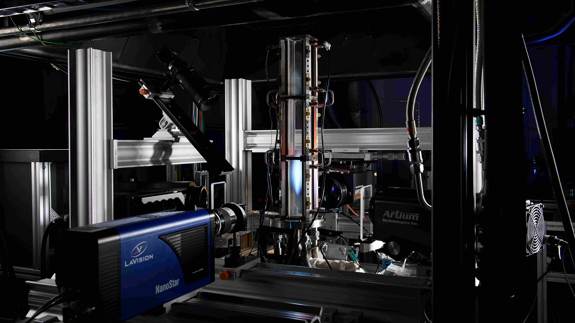 In diesem Brenner wird zunächst eine einzelne Düse getestet, später die vollständige Anordnung aller Düsen. Die blaue Flamme ist ein guter Hinweis darauf, dass sich kein Ruß bildet. Um den Brenner herum sind die Messgeräte für optische und Lasermessungen zu sehen.