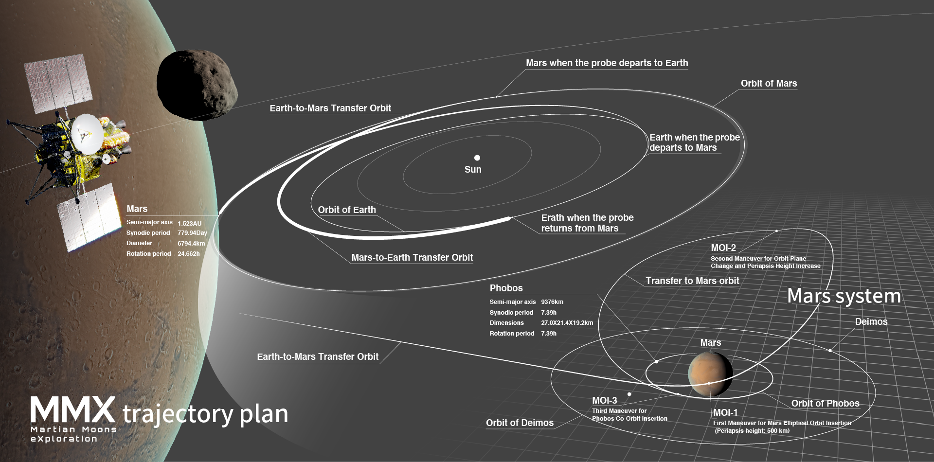 Im unteren Teil des Bildes ist der Hinflug der MMX-Raumsonde dargestellt. Wesentliche Meilensteine sind die Manöver zum Einschwenken in die Mars-Umlaufbahn (MOI-1), der Transfer vom Mars- zum Phobos-Orbit (MOI-2) und schließlich das Einschwenken in die Phobos-Umlaufbahn (MOI-3).