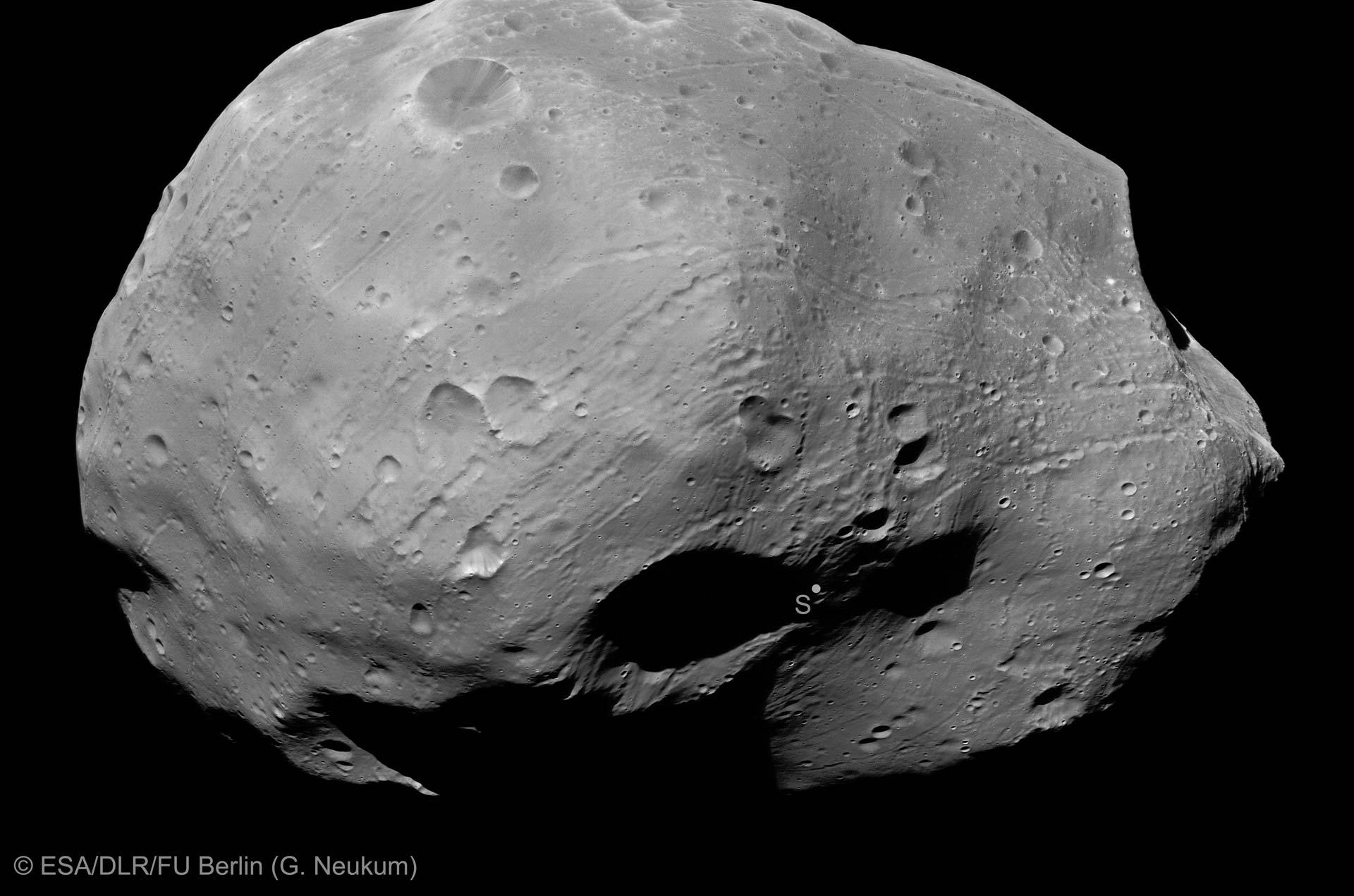 Mit 27 Kilometern ist Phobos der größere der beiden Marsmonde. Auf Phobos soll 2027 ein deutsch-französischer Rover im Rahmen der japanischen MMX-Mission abgesetzt werden.