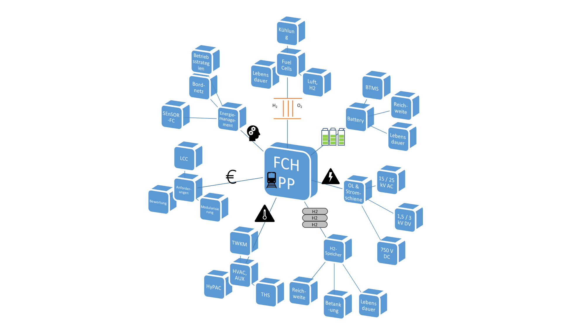 Im Teilprojekt 3000 Fuel Cell and Hybrid Power Pack (FCHPP) wird ein modularer und skalierbarer Systembaukasten für alternative Schienenfahrzeugantriebe entwickelt und demonstriert. Ziel des FCHPP Konzepts ist, die Dekarbonisierung der Bahn zu unterstützen, indem Alternativen zu den heute eingesetzten Dieselantrieben angeboten werden. FCHPP stellt mit Basisbausteinen anforderungsgerechte Energieversorgungssysteme und -architekturen für Schienenfahrzeuge bereit, dabei kommen skalierbare Teilsysteme als Module mit definierten Schnittstellen zum Einsatz. Ziel des ProCo TP 3000 (FCHPP) ist es, eine Systematik zur Auslegung eines anforderungsgerechten modularen und skalierbaren BZ- und Batterie-Hybridpowerpack (FCHPP) zu entwickeln. Die Arbeiten im Rahmen des Projekts erstrecken sich von Methoden über das Konzept und Technologien bis zur Auslegung und Demonstration sowie der anschließenden Energieverteilungs- und Kostenoptimierung (LCC))
