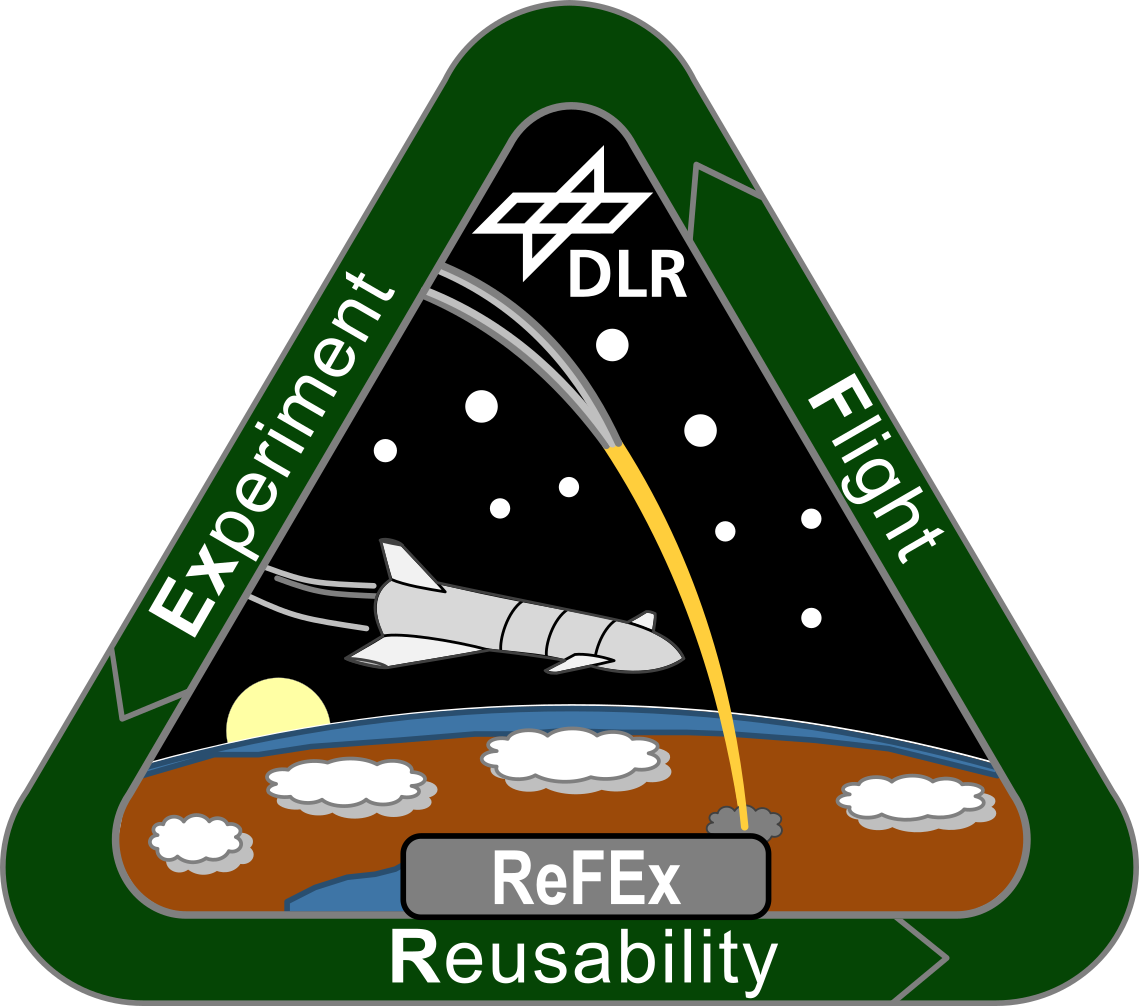 Projektpatch von ReFEx mit einer künstlerischen Darstellung der Flugbahn über Südaustralien. Die Form ist an das bekannte Recycling-Symbol angelehnt. Die Anzahl der Sterne stellt die Anzahl der beteiligten DLR-Institute dar.