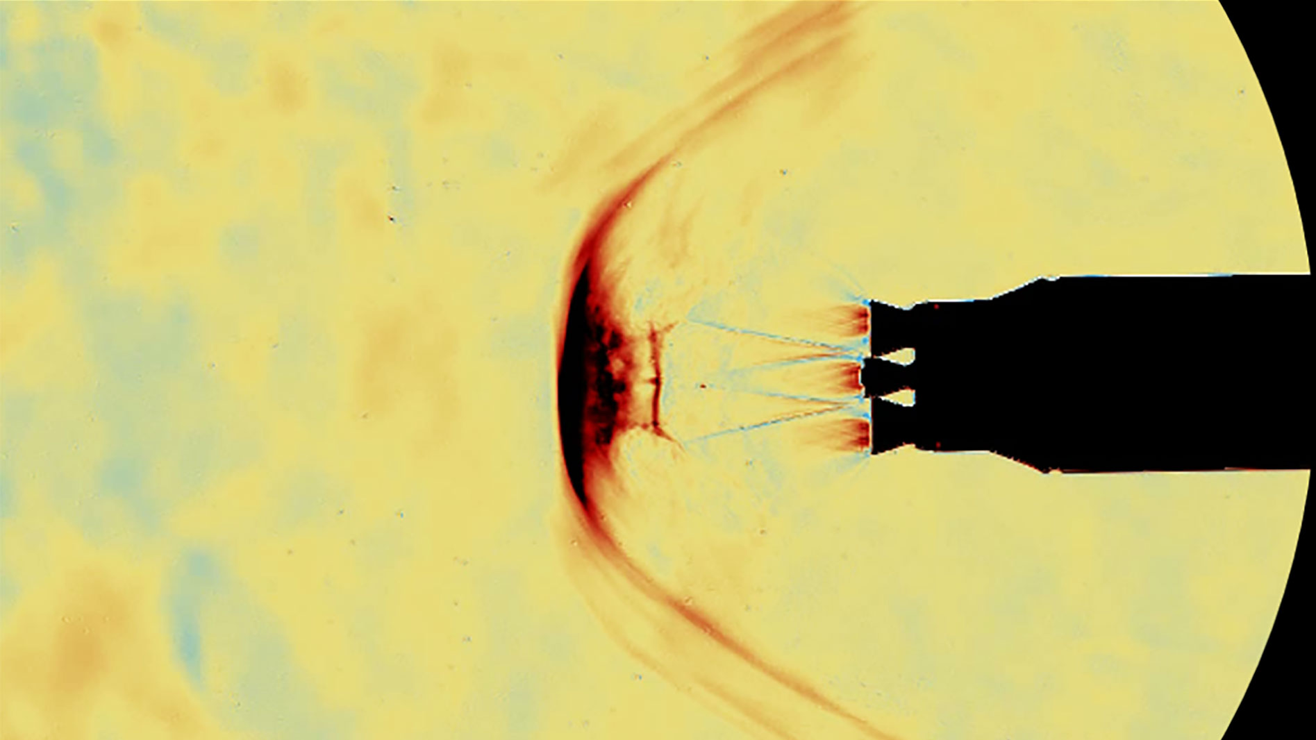 Das Bild zeigt das Modell einer wiederverwendbaren Raketenstufe beim Wiedereintritt in die Erdatmosphäre mit siebenfacher Schallgeschwindigkeit. Die Triebwerke feuern entgegen der Flugrichtung, um die Geschwindigkeit und somit die hohen Lasten beim Wiedereintritt zu reduzieren. Die Aufnahme stammen aus dem Hyperschall Windkanal in Köln (H2K). Hier wurde im Rahmen des ESA-Projekts RETPRO, das durch das Future Launchers Preparatory Programme (FLPP) finanziert wurde, eine Studie zum Einfluss durch Zündung einer unterschiedlichen Anzahl von Triebwerken auf die Gesamt-Aerodynamik der Raketenstufe durchgeführt. Die Strömung wird mithilfe des sogenannten Schlierenverfahrens sichtbar gemacht, bei dem Dichteunterschiede zu einer Ablenkung des durch die Messstrecke geleiteten Lichts führen. Hierdurch werden gerade bei Überschallströmungen die Strömungsstrukturen deutlich sichtbar. Im Bild mit drei aktiven Triebwerken ist die gegenseitige Beeinflussung der Treibstrahlen und eine deutlich zunehmende Dynamik erkennbar. Solche Ergebnisse können in der Zukunft dabei helfen, die Einflüsse dynamischen Strömungsverhaltens auf die Strukturen und das Steuerungsverhalten des Raumfahrzeugs zu berücksichtigen.