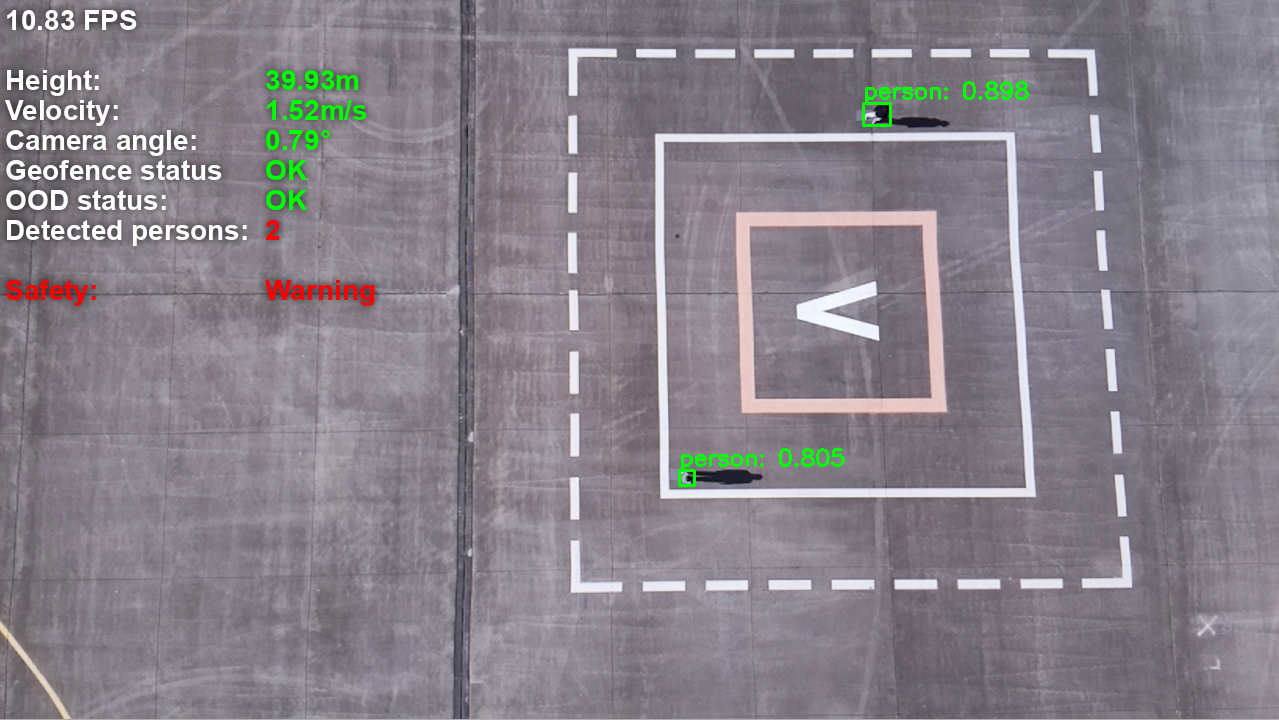 Um Schaden von Personen bei der Landung auf einem Vertiport zu vermeiden wird die Nutzung von Personendetektoren untersucht. Bedingungen, unter denen die Personenerkennungen trainiert wurde - wie beispielsweise der Kamerawinkel - werden während des Fluges überwacht, um das Vertrauen in die Erkennung zu erhöhen. Ebenso werden Betriebsgrenzen des Fluges, etwa das Geofencing, kontinuierlich überwacht, um im Notfall Gegenmaßnahmen einleiten zu können.