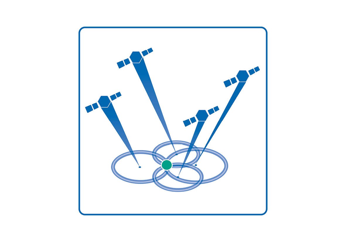 Die Satelliten sind weit über den Himmel verteilt. Diese Konstellation hat einen niedrigeren DOP-Wert und einen geringeren Positionierungsfehler (grüner Punkt).
