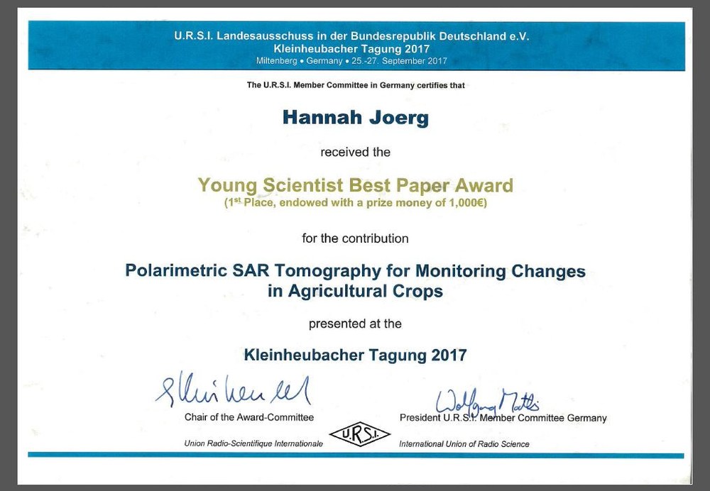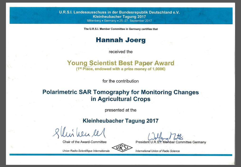 Wir freuen uns sehr bekannt geben zu können, dass unsere Kollegin Hannah Jörg auf der Kleinheubacher Tagung vom 25.-27. September 2017 mit dem "Young Scientist Award for Excellence" ausgezeichnet wurde. Die Urkunde wurde ihr vom Leiter des Awardkommitees Prof. Klinkenbusch (Uni Kiel) überreicht. Der Titel ihres Beitrags lautete "Polarimetric SAR Tomography for Monitoring Changes in Agricultural Crops". Herzlichen Glückwunsch, Hannah!
