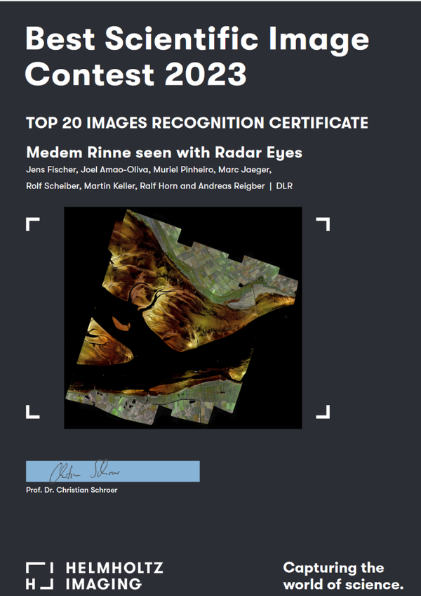 Wir freuen uns, bekannt geben zu können, dass unser Radarbild "Medem Rinne seen by Radar Eyes" zu den drei Gewinnern des GRSS IADF Photo Contest 2023 und zu den TOP 20 Bildern des Helmholtz Best Scientific Image Contest 2023 gehört, die auf eine Wanderausstellung durch Helmholtz-Zentren gehen werden. Insgesamt gab es 162 Einreichungen in diesem Wettbewerb. Das Bild wurde von Jens Fischer, Joel Amao-Oliva, Muriel Pinheiro, Marc Jaeger, Rolf Scheiber, Martin Keller, Ralf Horn und Andreas Reigber mitverfasst. Herzlichen Glückwunsch an alle Kollegen, die zu diesem Erfolg beigetragen haben! Mehr: GeoWAM.